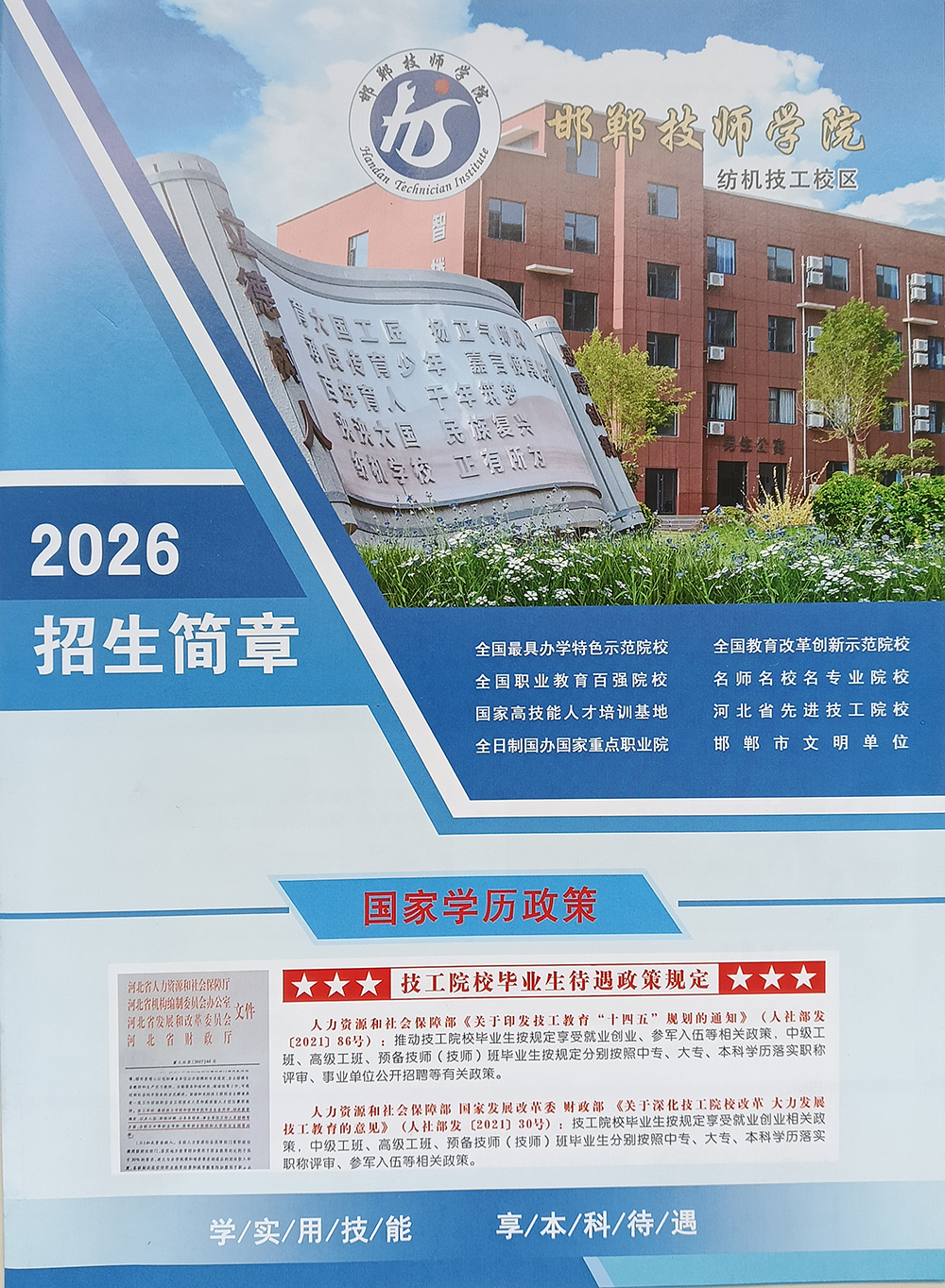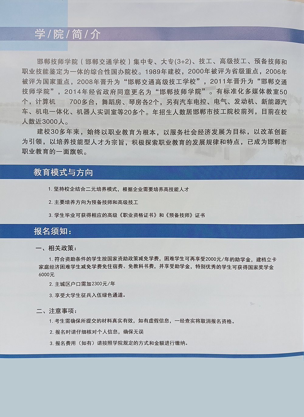 邯郸技师学院(邯郸交通学校)集中专、大专(3+2)、技工、高级技工、预备技师和职业技能鉴定为一体的综合性国办院校。1989年建校,2000年被评为省级重点,2006年被评为国家重点,2008年晋升为“邯郸交通高级技工学校”,2011年晋升为“邯郸交通技师学院”,2014年经省政府同意更名为“邯郸技师学院”。有标准化多媒体教室50个,计算机700多台,舞蹈房、琴房各2个,另有汽车电控、电气、发动机、新能源汽车、机电一体化、机器人实训室等20多个。年招生人数居邯郸市技工院校前列,目前在校人数近3000人。