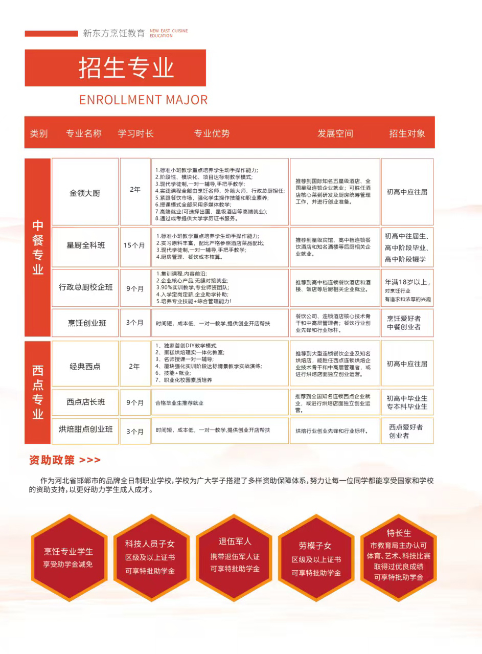 邯郸新东方烹饪学校是新东方烹饪教育旗下直属烹饪学校,是一所专注于培养紧缺型、技能型高素质人才的职业技能培训学校。校园环境优美,学术氛围浓郁,教学设施先进,师资力量雄厚,拥有宽敞明亮的理论教学厅、多功能实习大厅、标准化演示大厅、模拟酒店、时尚西点教学教室等教学场所,是热爱烹饪事业的有志人士学习烹饪的理想学校。