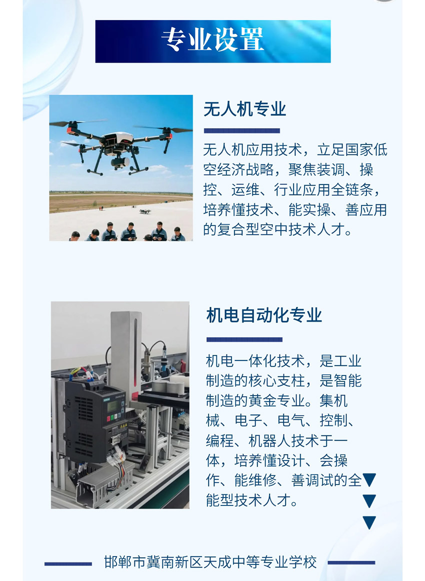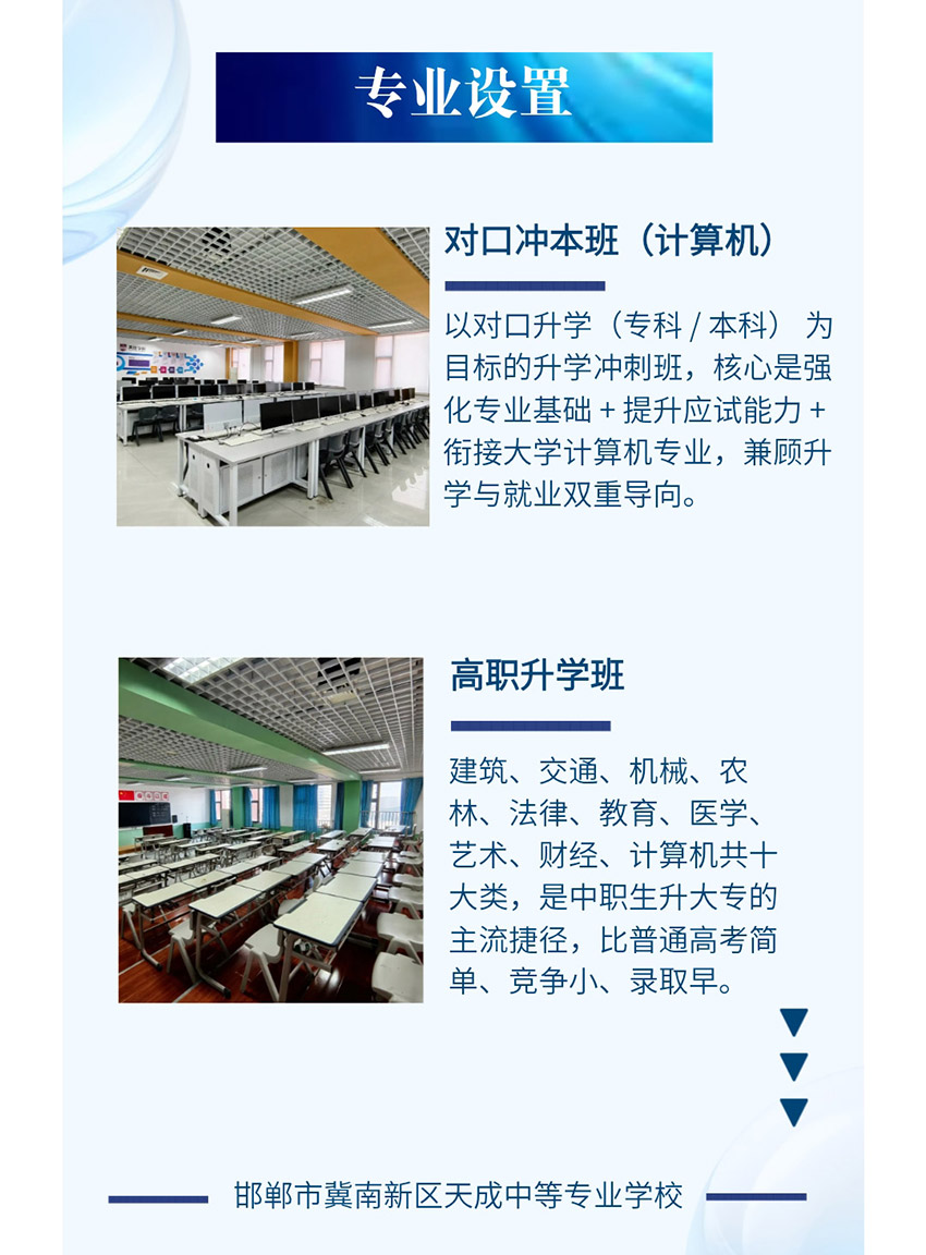 邯郸冀南新区天成中等专业学校坐落于中国邯郸职教城,是经河北省教育厅备案、邯郸教育主管部门批准成立的一所普通全日制高级中等职业学校,是冀南新区政府批准的招商引资项目。校区可容纳4500名学生。我校是一所集职教高考、艺术文化、特色专业、国际留学及高品质就业为一体,以打造产教融合职教新高地为目的,致力于建设最有成就感的示范性精品职业学校。